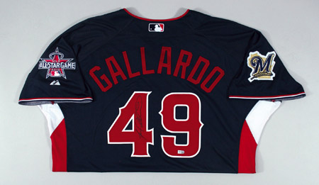 Description:2010 Yovani Gallardo autographed National League All-Star Game Workout Day/Home Run Derby Jersey. Navy blue knit jersey has "National" lettering across the front and "Gallardo" on the back. Gallardo has signed the shirt in black paint pen on the #4. The Milwaukee Brewers team patch is affixed to the right sleeve with MLB All-Star Game logo patch on the left sleeve. Majestic label found on tail front with "Cool Base" and size 48 flag tags affixed to the seam. Jersey has an affixed MLB hologram FJ177202 on the back and proper 0068 wash tag on the interior. Includes LOA from JSA: NM