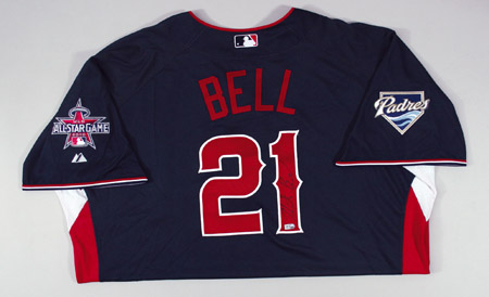 Description:2010 Heath Bell autographed National League All-Star Game Workout Day/Home Run Derby Jersey. Navy blue knit jersey has "National" lettering across the front and "Bell" on the back. Bell has signed the shirt in black paint pen on the #1. The San Diego Padres team patch is affixed to the right sleeve with MLB All-Star Game logo patch on the left sleeve. Majestic label found on tail front with "Cool Base" and size 54 flag tags affixed to the seam. Jersey has an affixed MLB hologram FJ177201 on the back and proper 0068 wash tag on the interior. Includes LOA from JSA: NM