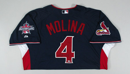 Description:2010 Yadier Molina autographed National League All-Star Game Workout Day/Home Run Derby Jersey. Navy blue knit jersey has "National" lettering across the front and "Molina" on the back. Molina has signed the shirt in black paint pen on the #4. The St. Louis Cardinals team patch is affixed to the right sleeve with MLB All-Star Game logo patch on the left sleeve. Majestic label found on tail front with "Cool Base" and size 48 flag tags affixed to the seam. Jersey has an affixed MLB hologram FJ177197 on the back and proper 0068 wash tag on the interior. Includes LOA from JSA: NM