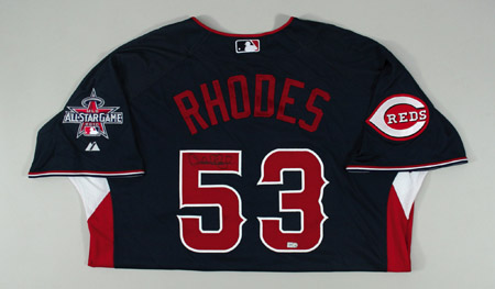 Description:2010 Arthur Rhodes autographed National League All-Star Game Workout Day/Home Run Derby Jersey. Navy blue knit jersey has "National" lettering across the front and "Rhodes" on the back. Rhodes has signed the shirt in black paint pen on the #5. The Cincinnati Reds team patch is affixed to the right sleeve with MLB All-Star Game logo patch on the left sleeve. Majestic label found on tail front with "Cool Base" and size 48 flag tags affixed to the seam. Jersey has an affixed MLB hologram FJ177193 on the back and proper 0068 wash tag on the interior. Includes LOA from JSA: NM