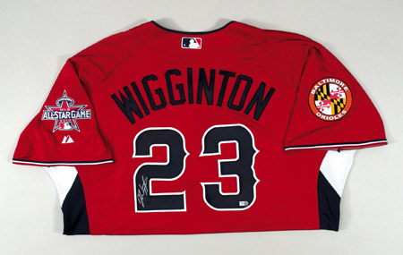 Description:2010 Ty Wigginton autographed American League All-Star Game Workout Day/Home Run Derby Jersey. Red knit jersey has "American" lettering across the front and "Wigginton" on the back. Wigginton has signed the shirt in silver paint pen on the #2. The Baltimore Orioles team patch is affixed to the right sleeve with MLB All-Star Game logo patch on the left sleeve. Majestic label found on tail front with "Cool Base" and size 50 flag tags affixed to the seam. Jersey has an affixed MLB hologram FJ171055 on the back and proper 0068 wash tag on the interior. Includes LOA from JSA: NM