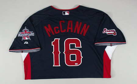 Description:2010 Brian McCann autographed National League All-Star Game Workout Day/Home Run Derby Jersey. Navy blue knit jersey has "National" lettering across the front and "McCann" on the back. McCann has signed the shirt in black paint pen on the #6. The Atlanta Braves team patch is affixed to the right sleeve with MLB All-Star Game logo patch on the left sleeve. Majestic label found on tail front with "Cool Base" and size 48 flag tags affixed to the seam. Jersey has an affixed MLB hologram FJ177190 on the back and proper 0068 wash tag on the interior. Includes LOA from JSA: NM