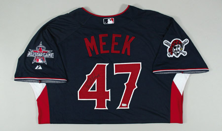 Description:2010 Evan Meek autographed National League All-Star Game Workout Day/Home Run Derby Jersey. Navy blue knit jersey has "National" lettering across the front and "Meek" on the back. Meek has signed the shirt in black paint pen on the #4. The Pittsburgh Pirates team patch is affixed to the right sleeve with MLB All-Star Game logo patch on the left sleeve. Majestic label found on tail front with "Cool Base" and size 48 flag tags affixed to the seam. Jersey has an affixed MLB hologram FJ177189 on the back and proper 0068 wash tag on the interior. Includes LOA from JSA: NM
