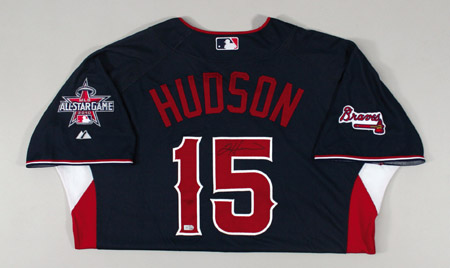 Description:2010 Tim Hudson autographed National League All-Star Game Workout Day/Home Run Derby Jersey. Navy blue knit jersey has "National" lettering across the front and "Hudson" on the back. Hudson has signed the shirt in black paint pen on the #5. The Atlanta Braves team patch is affixed to the right sleeve with MLB All-Star Game logo patch on the left sleeve. Majestic label found on tail front with "Cool Base" and size 46 flag tags affixed to the seam. Jersey has an affixed MLB hologram FJ177184 on the back and proper 0068 wash tag on the interior. Includes LOA from JSA: NM