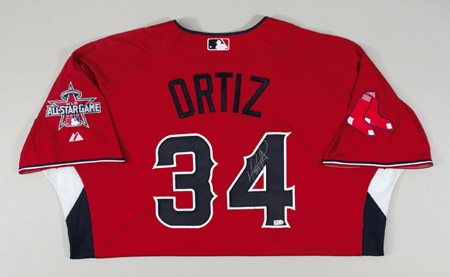 Description:2010 David Ortiz autographed American League All-Star Game Workout Day/Home Run Derby Jersey. Red knit jersey has "American" lettering across the front and "Ortiz" on the back. Ortiz has signed the shirt in silver paint pen on the #4. The Boston Red Sox team patch is affixed to the right sleeve with MLB All-Star Game logo patch on the left sleeve. Majestic label found on tail front with "Cool Base" and size 52 flag tags affixed to the seam. Jersey has an affixed MLB hologram FJ171057 on the back and proper 0068 wash tag on the interior. Includes LOA from JSA: NM