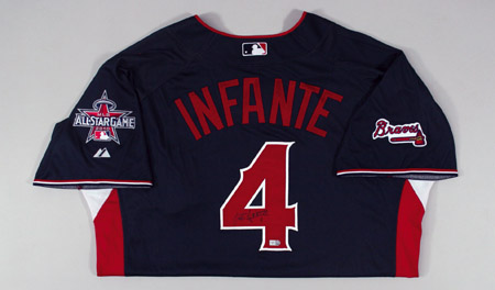 Description:2010 Omar Infante autographed National League All-Star Game Workout Day/Home Run Derby Jersey. Navy blue knit jersey has "National" lettering across the front and "Infante" on the back. Infante has signed the shirt in black paint pen on the #4. The Atlanta Braves team patch is affixed to the right sleeve with MLB All-Star Game logo patch on the left sleeve. Majestic label found on tail front with "Cool Base" and size 46 flag tags affixed to the seam. Jersey has an affixed MLB hologram FJ177178 on the back and proper 0068 wash tag on the interior. Includes LOA from JSA: NM