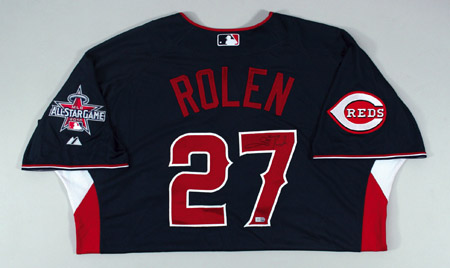 Description:2010 Scott Rolen autographed National League All-Star Game Workout Day/Home Run Derby Jersey. Navy blue knit jersey has "National" lettering across the front and "Rolen" on the back. Rolen has signed the shirt in black paint pen on the #7. The Cincinnati Reds team patch is affixed to the right sleeve with MLB All-Star Game logo patch on the left sleeve. Majestic label found on tail front with "Cool Base" and size 50 flag tags affixed to the seam. Jersey has an affixed MLB hologram FJ177182 on the back and proper 0068 wash tag on the interior. Includes LOA from JSA: NM