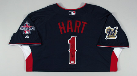 Description:2010 Cory Hart autographed National League All-Star Game Workout Day/Home Run Derby Jersey. Navy blue knit jersey has "National" lettering across the front and "Hart" on the back. Hart has signed the shirt in black paint pen on the #1. The Milwaukee Brewers team patch is affixed to the right sleeve with MLB All-Star Game logo patch on the left sleeve. Majestic label found on tail front with "Cool Base" and size 50 flag tags affixed to the seam. Jersey has an affixed MLB hologram FJ177181 on the back and proper 0068 wash tag on the interior. Includes LOA from JSA: NM