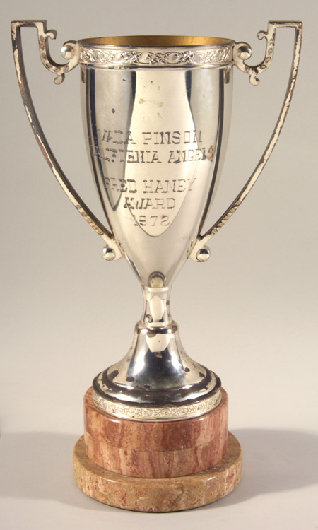 Description:1972 Vada Pinson Fred Haney Award trophy. Handled metal cup sitting atop marble base has been engraved on the front, "Vada Pinson, California Angels, Fred Haney Award 1972." Stands 16" tall with 6" diameter base. Light scattered wear with flaking to silver overlay throughout. Includes letter of provenance from Pinson family: EX-EX/MT