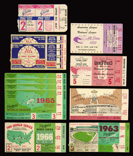 Description:Collection of World Series and All-Star game ticket stubs c.1950-60s. Includes lot of (4) All-Star Game and (8) World Series ticket stubs. All-Star Game stubs from 1959, (2) 1961, and (1967) and World Series stubs from 1959, 1962, 1963 (Game 3 - Mantle HR, GD/VG), (4) 1965, and 1966. Varying degrees of corner, edge, and surface wear throughout. Includes letter of provenance from Pinson family: Range GD/VG-EX/MT, Avg. VG/EX-EX