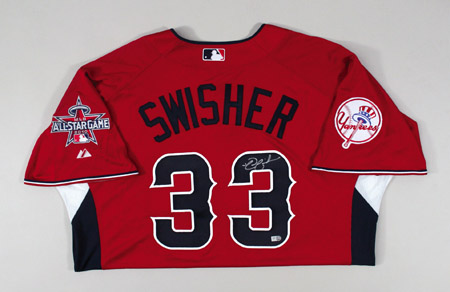 Description:2010 Nick Swisher autographed American League All-Star Game Workout Day/Home Run Derby Jersey. Red knit jersey has "American" lettering across the front and "Swisher" on the back. Swisher has signed the shirt in silver paint pen on the #3. The New York Yankees team patch is affixed to the right sleeve with MLB All-Star Game logo patch on the left sleeve. Majestic label found on tail front with "Cool Base" and size 48 flag tags affixed to the seam. Jersey has an affixed MLB hologram FJ171072 on the back and proper 0068 wash tag on the interior. Includes LOA from JSA: NM