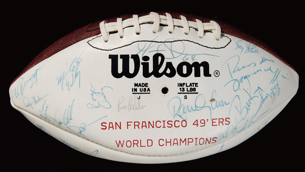 Description:San Francisco 49ers "World Champions" autographed football c.1984. Wilson P.Rozelle Official NFL white panel football with "San Francisco 49'ers World Champions" block lettered on side has been signed by (45) including Montana, Rice, Craig, Clarke, and others. Ink signatures rate 7 to 9 out of 10. Ball exhibits light scattered wear/soiling. Air nozzle has fallen into ball. Includes LOA from JSA: Ball EX, Sigs. EX-NM