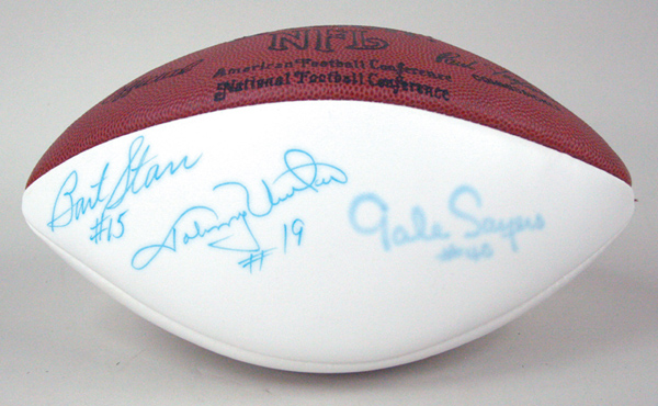 Description:Johnny Unitas autographed football with Starr and Sayers. Wilson P.Tagliabue Official NFL white panel football has been signed by Johnny Unitas, Gale Sayers, and Bart Starr with all (3) Hall of Famers inscribing their jersey number. Ink and marker signatures rate 7/8 to 8 out of 10. Includes LOA from JSA: EX/MT
