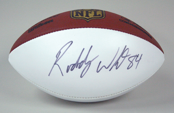 Roddy White autographed football. Wilson R.Goodell "The Duke" NFL white panel football has been signed on the side in black marker rating 8 out of 10. Includes COA from PSA/DNA: NM