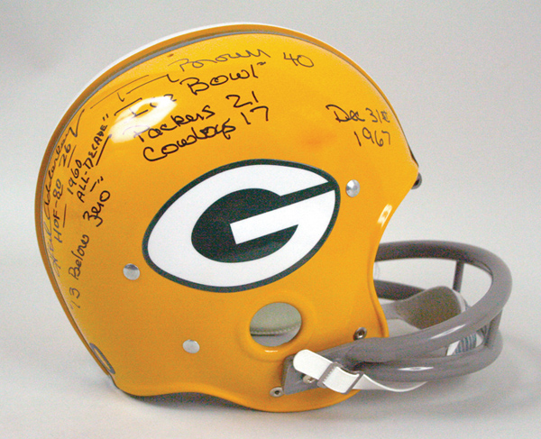 Description:Adderley and Brown signed Packers throwback helmet with "Ice Bowl" inscriptions. Green Bay Packers throwback style suspension helmet by Riddell has been signed on the side by Herb Adderley and Tom Brown. Both have added numerous inscriptions as follows: Adderley "HOF - 80, 26, 1960 All Decade, 13 Below Zero" and Brown "40, Ice Bowl, Packers 21 Cowboys 17, Dec 31st 1967." The black marker signatures rate 9 out of 10. Size "7 3/8." Includes LOA from JSA: EX/MT-NM