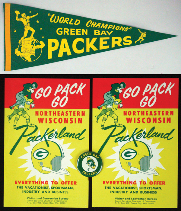 Description:Green Bay Packers "World Champions" pennant autographed by Bart Starr and dated from the "Ice Bowl." Full sized green felt pennant remains in well preserved condition with several vertical creases. Signed in the period, "Bart Starr 12-31-67" in black marker rating 8 out of 10. Additional "12-31-67 Dick + Norma" notation written in unknown hand along with "B.Starr" identifier. Highly uncommon pennant with desirability further enhanced by direct connection to one of the most noteworthy games in history. Includes pair of highly visual "Go Pack Go" Green Bay promotional flyers and Packers souvenir pin. Includes LOA from JSA: Overall EX/MT-NM