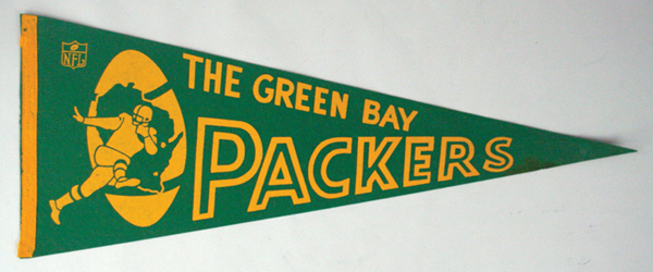 Green Bay Packers pennant c.1960s. Full sized green felt pennant with printed on lettering and player graphic. Light scattered wear with several mounting pinholes and very minor surface loss: EX/MT