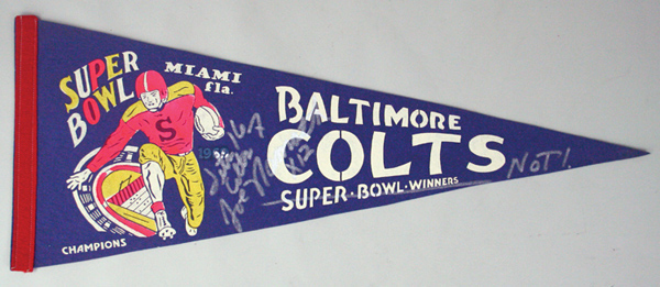 Description:Baltimore Colts Super Bowl III "Winners" pennant c.1969 autographed and corrected by Joe Namath. Full sized blue felt pennant with colorful printed on graphic and lettering proclaiming the Colts to have won. Signed on the front, "Joe Namath" with jersey number "12" inscription. Namath has hand written the correct game score, "Jets 16, Colts 7" and drawn a line through the "Super Bowl Winners" portion of the lettering, writing "Not!" afterwards. Minimal wear. Includes LOA from JSA: EX/MT