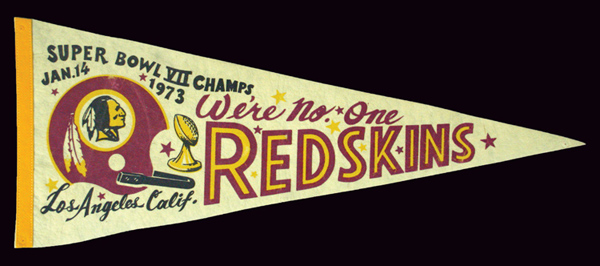Washington Redskins Super Bowl VII Champs pennant c.1973. Full sized cream colored pennant with highly visual printed on graphic and lettering. Minor age toning and scattered wear with several small mounting holes at extremes: EX