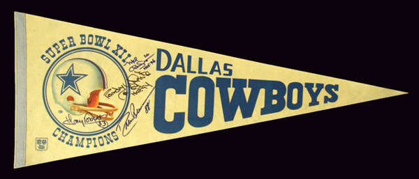 Description:Dallas Cowboys Super Bowl XII Champions autographed pennant c.1978. Full sized cream colored pennant has been signed on the front by Mel Ronfro, Randy White, Tony Dorsett, and Drew Pearson. Marker signatures rate 8 to 9 out of 10. Exhibits minor age toning with pair of minute pinholes used in mounting. Includes LOA from JSA: EX/MT