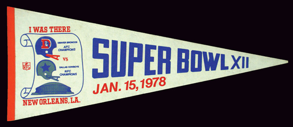 Description:Cowboys vs. Broncos Super Bowl XII "I Was There" pennant c.1978. Full sized white felt pennant with printed on lettering and graphics exhibits moderate soiling and light wear throughout. Very tip of pointed end missing. Velcro from mounting on back: EX