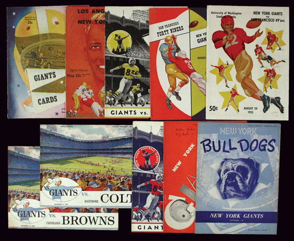 Description:Lot of (10) 1947-58 New York Giants programs. Includes Oct. 19, 1947 vs. Boston Yanks, Sept. 30, 1949 vs. Bulldogs, Oct. 30, 1949 vs. Cardinals, Sept. 27, 1953 vs. Rams, Aug. 20, 1955 vs. 49ers, Oct. 20, 1957 vs. Steelers (ink on cover), Dec. 1, 1957 vs. 49ers, Aug. 17, 1958 vs. 49ers, Nov. 9, 1958 vs. Colts, and Dec. 14, 1958 vs. Browns. Condition varies throughout with scattered, mostly light, cover, edge, and handling wear. All bound edges intact with minor separation to several. A few have front cover check mark or date notation. Minor interior age toning/wear: Range VG/EX-EX/MT, Avg. EX
