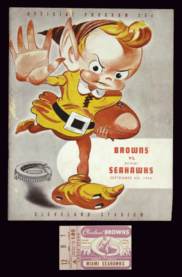 Description:Sept. 6, 1946 Cleveland Brown vs. Miami Seahawks program and ticket stub (1st Browns game). Desirable original pairing from the first game in Franchise history. Cleveland would go on to win the AAFC Championship. Program exhibits typical light handling wear throughout with several small areas of cover scuffing. Several pencil notations on center roster page. Stub is unusually clean with little no wear visible on front and neatly torn right edge. Small hairline crease on right side. Highly desirable group related to one of the game's legendary teams: Program EX, Stub EX/MT
