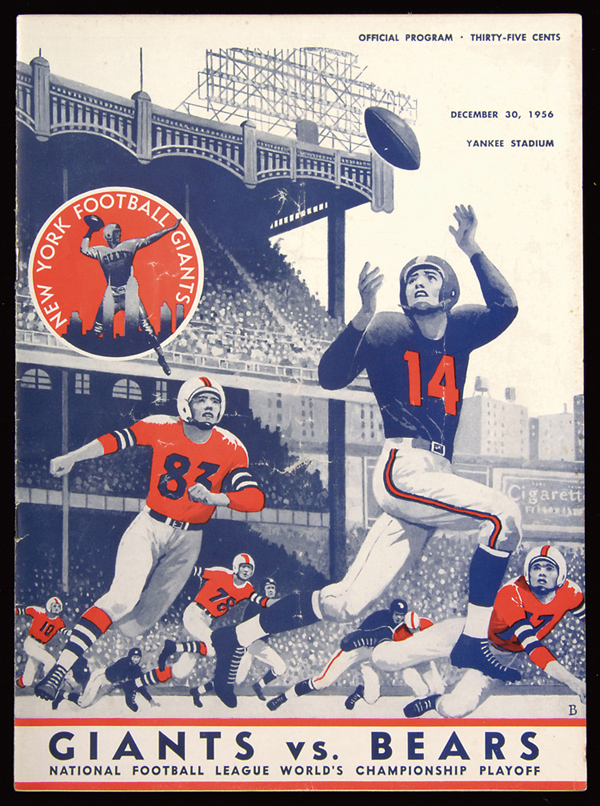 December 30, 1956 Giants vs. Bears NFL Championship game program. Original program issued for game played at Yankee Stadium exhibits general handling wear and scattered soiling with vertical centerfold: VG/EX-EX