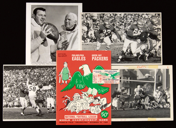 Description:December 26, 1960 Eagles vs. Packers Championship Game program, ticket stub, and photographs. Original program remains in exceptionally strong condition (NM-Mint) with hint of wear at corners/edges and extremely minor back cover discoloration. Ticket stub (EX/MT) has light touch at corners and scattered surface creasing. Also includes (4) game related press/period photographs (VG/EX-EX/MT) with the most notable being 7.75"x12" game action image stamped "Sports Illustrated Photograph" on verso: Range VG/EX-NM/MT