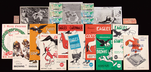 Description:1960 Philadelphia Eagles programs, ticket stubs, and press photographs (21 pieces). Includes program and matching game ticket stub from the following games: Sept. 25 vs. Browns at Franklin Field, Oct. 9 vs. Cardinals at Franklin Field, Oct. 16 vs. Lions at Franklin Field, Oct. 23 vs. Browns at Cleveland, Nov. 6 vs. Steelers at Franklin Field, Nov. 13 vs. Redskins at Franklin Field, Nov. 27 vs. Giants at Franklin Field, and Dec. 18 vs. Redskins at Washington (final game in Griffith Stadium). Also includes programs (no stubs) from Sept. 17 vs. Colts at Hershey and Dec. 4 program vs. Cardinals at St. Louis games and (3) period season related press photographs: Range VG/EX-NM (Avg. EX-EX/MT)