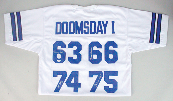 Description:Dallas Cowboys "Doomsday Defense I" autographed jersey. Uniquely styled white jersey with sewn on player numbers (front and back) representing the (4) players comprising the Line of the Cowboys famed Doomsday Defense. Each has signed on their respective number including Bob Lily, Jethroe Pugh, Larry Cole, and George Andrie. Silver paint pen signatures rate 9 out of 10. Size "XL" tag in collar. Includes COA from JSA: EX/MT-NM
