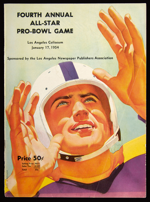January 17, 1954 Pro-Bowl Game program (4th Annual). Original program exhibits light general handling wear with water stain on front cover which bears crease on right hand portion: EX/MT with note to stain