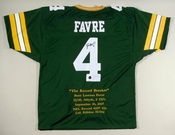 Description:Brett Favre autographed limited edition Green Bay Packers jersey. Green mesh jersey with sewn on player number "4" on front, back, and sleeves and "Favre" nameplate across the back. Stats relevant to the September 30, 2007 game in which he became the all-time career touchdown pass leader have been embroidered below as has limited edition 52/104 numbering. Signed on the back number, "Brett Favre" in black marker rating 8 out of 10. Includes LOA from JSA and has Favre's personal certification label affixed: EX/MT-NM
