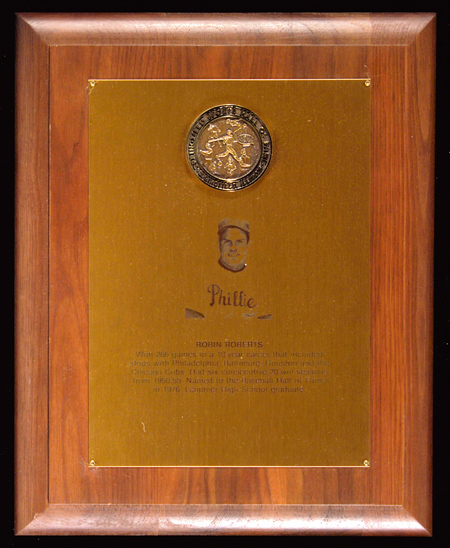 Description:Robin Roberts Springfield Sports Hall of Fame plaque. Attractive mahogany plaque as presented to Roberts in honor of his induction into the Springfield, IL Sports Hall of Fame. The plaque measures 12"x15" with applied brass faìade having an image of Roberts at center beneath an embossed Springfield HOF medallion. Includes letter of provenance from the Roberts family: EX-MT