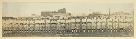 Description:1924 Columbus Senators baseball team panoramic photograph. Matted and framed 9"x32" original image picturing the American Association team posed in full uniform. Players are identified in a separately matted key underneath the image including Molesworth, Carleton, Demaree, and Grimes. Image quality remains very fine with some age spotting at far right edge and 4" to 5" surface tears at both right and left borders: VG-EX