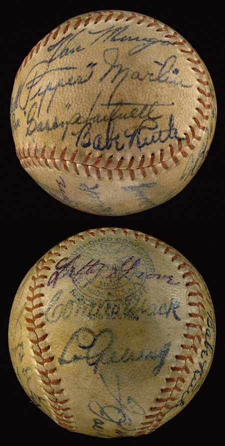 Description:Hall of Famers and stars autographed baseball with Babe Ruth c.1930s. Reach W.Harridge OAL baseball has been signed by (21) including Ruth, Gehrig, Grove, Mack, Medwick, Collins, Dickey, DiMaggio, Greenberg, Hartnett, and others. Ink signatures rate 6 to 8 out of 10 with Ruth the strongest (8) and Gehrig (7) displaying and slight background smudge/transfer. The ball was likely signed at an All-Star game in the mid 1930s and possibly was brought to more than one such event. The majority of those having signed played in at least one All-Star Game. Ball exhibits moderate even toning with a very light coating of shellac applied in the period and a small scuff to one panel. Interesting and unique player mix representing some the biggest stars of the time. Includes LOA from JSA: Ball VG/EX-EX, Sigs EX-EX/MT