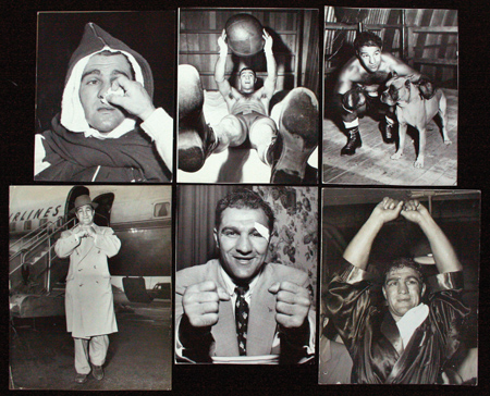 Description:Lot of (6) Rocky Marciano press photographs c.1950s-60s. Assortment of choice period images of The Champ training, during/just after a fight, and in street clothes. Moderate scattered wear throughout with all mounted to cardboard backing. Size range is approximately 6.75"x8.25" to 7.75"x9.75": Range VG-EX