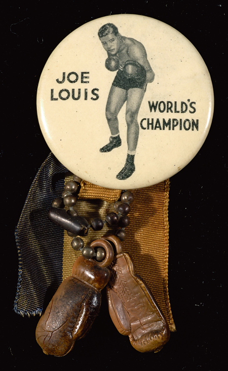 Joe Louis "World's Champion" souvenir pin c.1940s. 1.75" Pin depicting Louis retains original ribbon and boxing glove charms. Light wear and age toning: EX-EX/MT