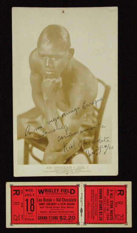 Description:Kid Chocolate autographed photograph along with full ticket stub c.1930s. Sepia tone 5"x8" image of Kid Chocolate signed, "A mi viejo amigo Enrique Sanchez cariisamente Kid Chocolate NY 3/24/36". Signature rates 8 out of 10. The photo itself has two tiny pinholes at the top and bottom margin: EX. The lot also includes a full ticket as issued for the July 18, 1934 fight between Kid Chocolate and Leo Rodak at Wrigley Field in Chicago: EX-MT