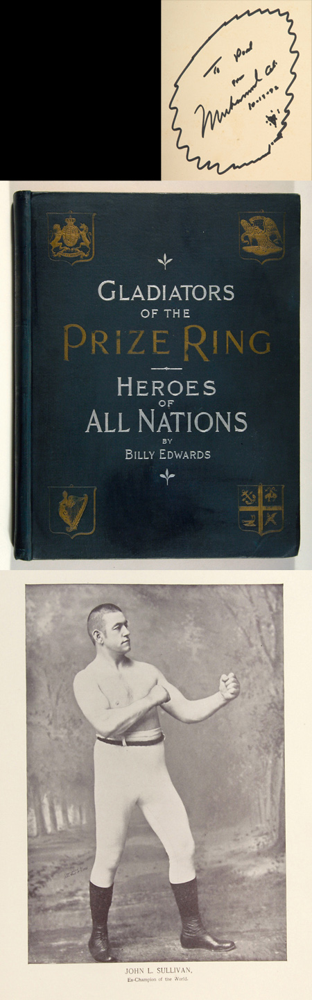 Description:Unique 1895 "Gladiators of the Prize Ring Heroes of All Nations" autographed by Muhammad Ali. Classic oversized hard cover boxing volume features numerous full size illustration plates depicting the star pugilists of the period. Illustrations include Kilrain, Sullivan, and Corbett. The interior cover page has been signed, "To Paul from Muhammad Ali 10/19/92" with a hand drawn perimeter also in Ali's hand. The book itself has some tape repairs to several interior tears at the bottom margin of some pages and has been rebound at both interior front and back covers. Includes LOA from JSA (autograph): EX