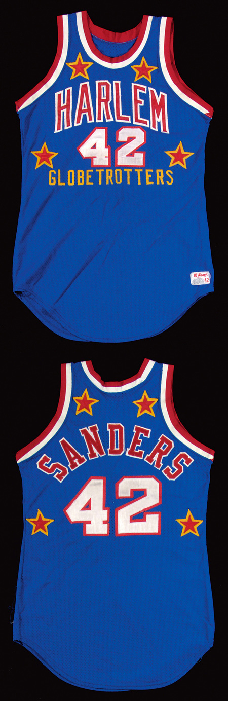 Description:James "Twiggy" Sanders Harlem Globetrotters c.1974-78. Blue mesh jersey as worn by longtime Harlem Globetrotter "Twiggy" Sanders originating from the personal collection of former team photographer Steven Goldstein. The jersey front retains its original team name along with (4) stars and uniform #42. Back of the jersey features "Sanders" player name with (4) stars and "42" uniform number. The jersey shows evident use including "puckering" to the lettering and numerals. Includes LOA from Hunt Auctions, letter of authenticity from the Harlem Globetrotters, and letter of provenance from team photographer Steven Goldstein: EX
