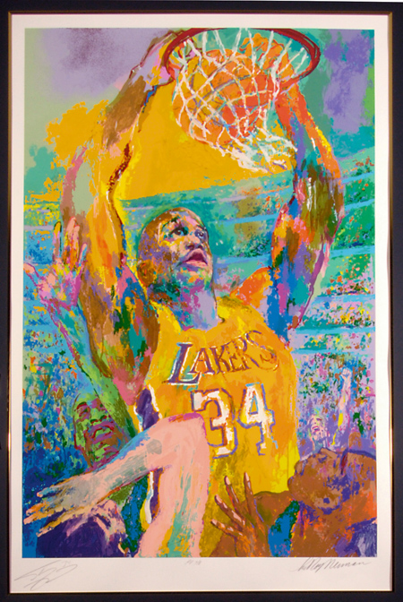 Description:Shaquille O'Neal autographed printer's proof serigraph by LeRoy Neiman. Large format color serigraph picturing O'Neal dunking a basketball in Lakers uniform. Signed at the bottom margin by O'Neal and Neiman with "PP 7/8" numbering. 28"x43" Matted and framed: NM