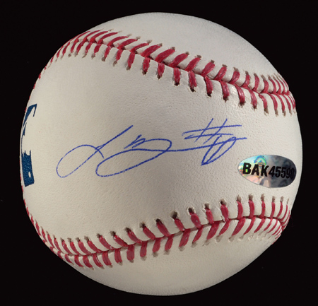 Description:LeBron James single signed baseball. Rawlings B.Selig Official Major League baseball has been signed on the sweetspot in blue ink rating 9 out of 10. One of a very few baseballs signed by James for UDA. Includes original UDA box, felt bag, and COA with matching numbered certification label: NM