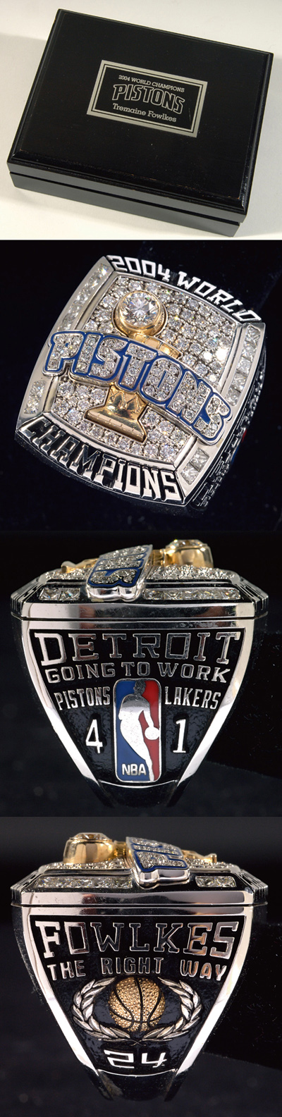 Description:2004 Detroit Pistons World Championship ring. Stunning original ring as presented to Pistons' player Tremaine Fowlkes as a member of the World Champion Pistons. The ring presents beautifully with a 1/2 carat brilliant cut diamond inset onto a gold NBA Finals trophy graphic. Background field consists of (102) diamonds ranging in size from .003 to .04 carat weight along with "Pistons" team name across the front. "2004 World Champions" lettering is found at the top and bottom margins with (14) additional princess cut diamonds on either side margin. One side panel displays "Fowlkes The Right Way" with "24" and a basketball shaped emblem. The other panel has "Detroit Going to Work Pistons 4 Lakers 1" along with an enamelwork NBA logo. Marked 14K Intergold on the interior ring band. The ring retains its original lidded wooden box with inscribed metal placard on the lid. Outstanding rarity ranks as one of the more desirable and ornate NBA related championship rings of its type. Includes Certificate of Appraisal from Intergold with assigned value of $18,000: NM