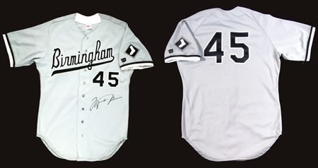Description:Michael Jordan autographed Birmingham Barons jersey prepared for use in Space Jam motion picture (UDA). High quality road gray jersey with "Birmingham" team name across the front and player number "45" on front and back. White Sox affiliation "sock" logo patch on sleeve. Wilson manufacturer's tag in collar with size "48." It has been signed on the front in black marker rating 9 out of 10. The shirt was prepared for use in the movie Space Jam and was part of Jordan's wardrobe. Exhibits light scattered usage wear with soiling on white sleeve trim. Includes COAs from Upper Deck Authenticated and Sportsrobe: EX/MT