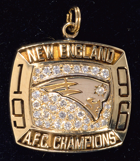 Description:1996 New England Patriots AFC Championship pendant. 10K gold pendant as issued to honor the AFC Champion Patriots in 1996 features the Patriots logo across the front with numerous inset diamonds surrounded by "New England AFC Champions 1996". Marked 10K Balfour on the reverse: NM
