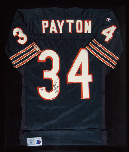 Description:Walter Payton autographed Chicago Bears jersey. Full size Chicago Bears mesh jersey by Champion having been signed across the back, "Walter Payton 34" in black sharpie. Signature remains very strong rating 9 out of 10. The jersey is handsomely framed in a shadowbox style display. Includes LOAs from JSA and PSA/DNA: NM
