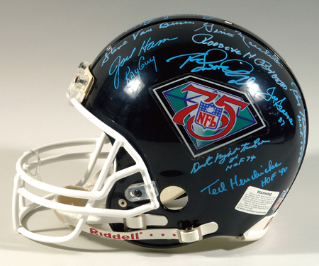 Description:Hall of Fame autographed NFL 75th Anniversary helmet. Riddell VSR-4 full sized helmet with "NFL 75" logo decals applied on either side has been signed by (24) including Rice, Nitschke, Sayers, Ditka, Brown, Graham, Greene, Lane, and others. Several have inscribed their induction year. Signatures were done in neon blue paint pen offering stark contrast with black background and rate 7/8 to 9 out of 10. Light scattered soiling/wear with several autographs incidentally scratched (more substantive loss to 1). Includes LOA from JSA: Overall EX/MT