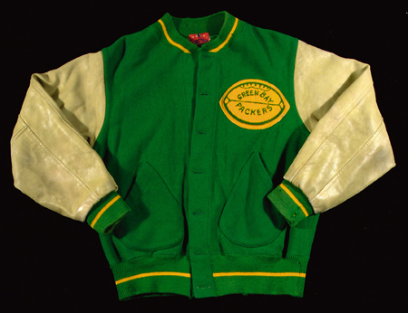 Description:Green Bay Packers professional model football sideline jacket c.1960s. Rare original jacket of a kelly green body having white leather sleeves with its original Packers embroidered patch on the front. Early 1960s King O'Shea manufacturing label is affixed inside the collar with "44" size tag on the interior tail front. The buttons have been replaced and the jacket itself exhibits light to moderate general wear. Includes letter of provenance from the original recipient: EX