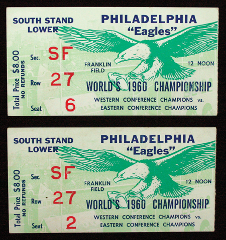 December 26, 1960 Eagles vs. Packers NFL Championship Game ticket stubs (2). Pair of original ticket stubs exhibiting a hint of corner wear and age toning with clean tear. Otherwise in unusually strong condition: EX/MT